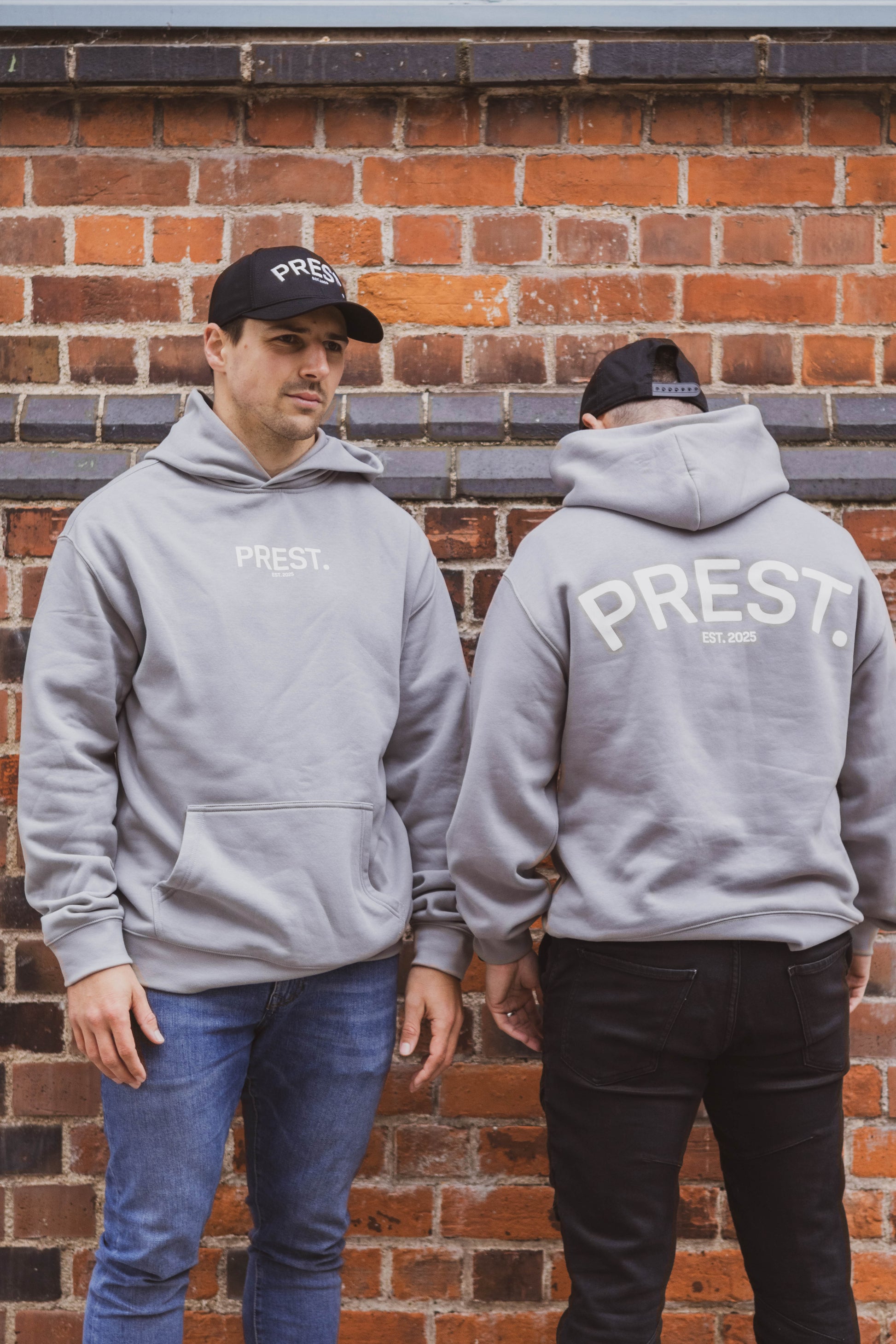 Minimalist on the front with the PREST. logo and establishment year in crisp white, it makes its true statement from behind – an oversized arched PREST. print that turns heads wherever you go. The spacious kangaroo pocket adds function to fashion, perfect for keeping essentials close or warming your hands on cold days.