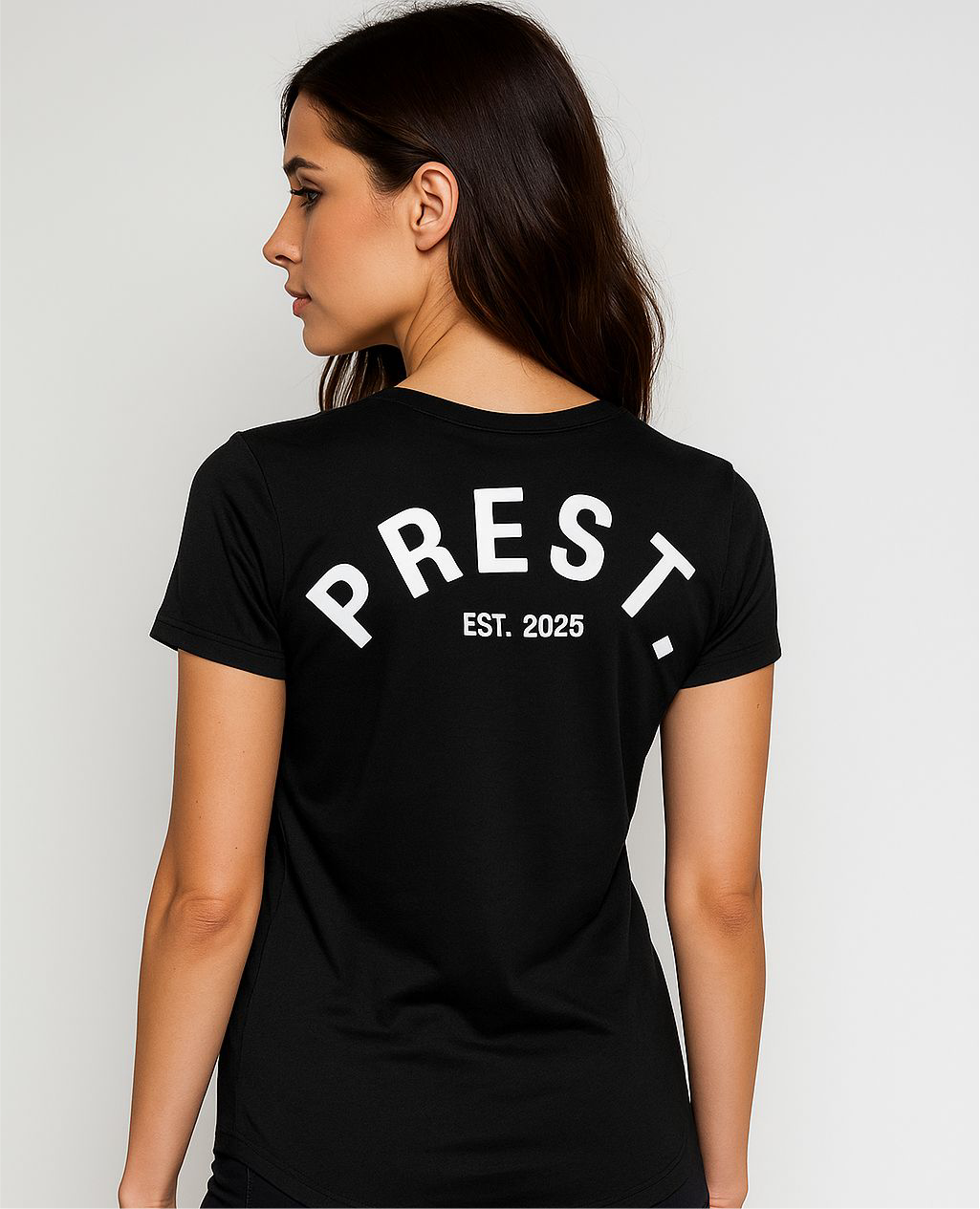 Bold. Minimal. Elevated. The PREST Women’s T-Shirt brings sleek streetwear energy to your everyday look. Designed with a flattering feminine fit and curved hem, this black t-shirt features a striking arched PREST. logo and EST. 2025 detail printed across the back in crisp white, making a statement even when you’re walking away.